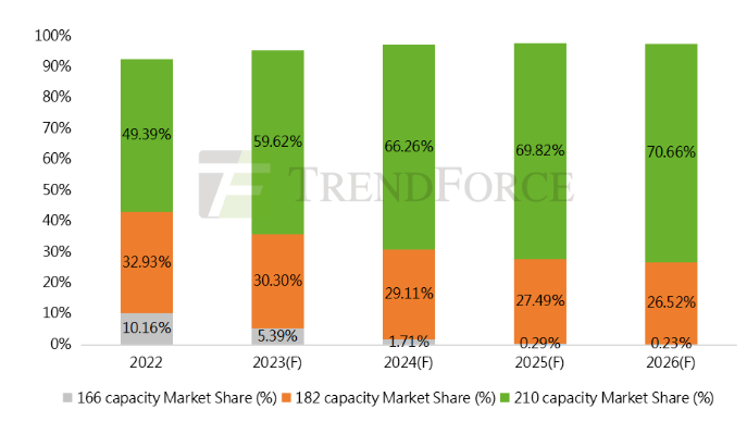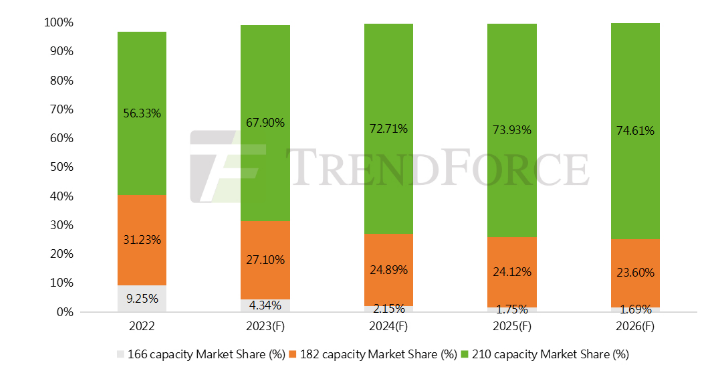 圖:2022-2026年不同尺寸電池片產(chǎn)能占比趨勢(shì)(設(shè)備產(chǎn)能,單位:%)