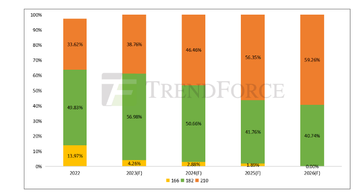 圖:2022-2026年不同尺寸硅片產(chǎn)能占比趨勢(shì)(單位:%)